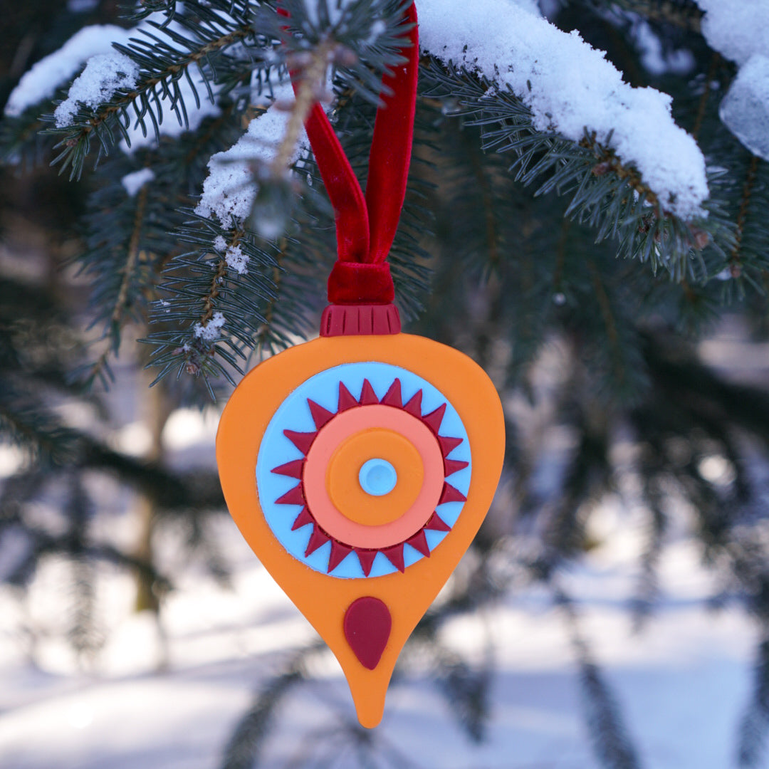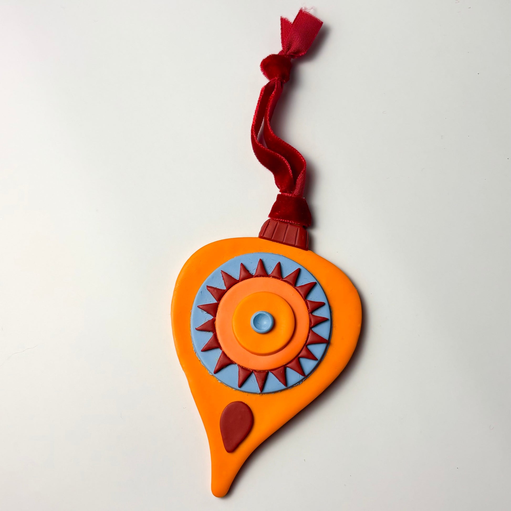 Ajoutez une touche rétro et colorée à votre sapin avec cet ornement en argile polymère aux tons orangés, rouges et bleu ciel. Chaque détail est façonné à la main pour créer un motif graphique unique qui ressort magnifiquement parmi les branches enneigées. L’ornement est ultra léger pour ne pas alourdir les branches et est suspendu à un ruban de velours rouge pour une finition chic et festive. Pièce disponible en quantité limitée, parfaite pour commencer ou compléter une collection de décorations artisanales.
