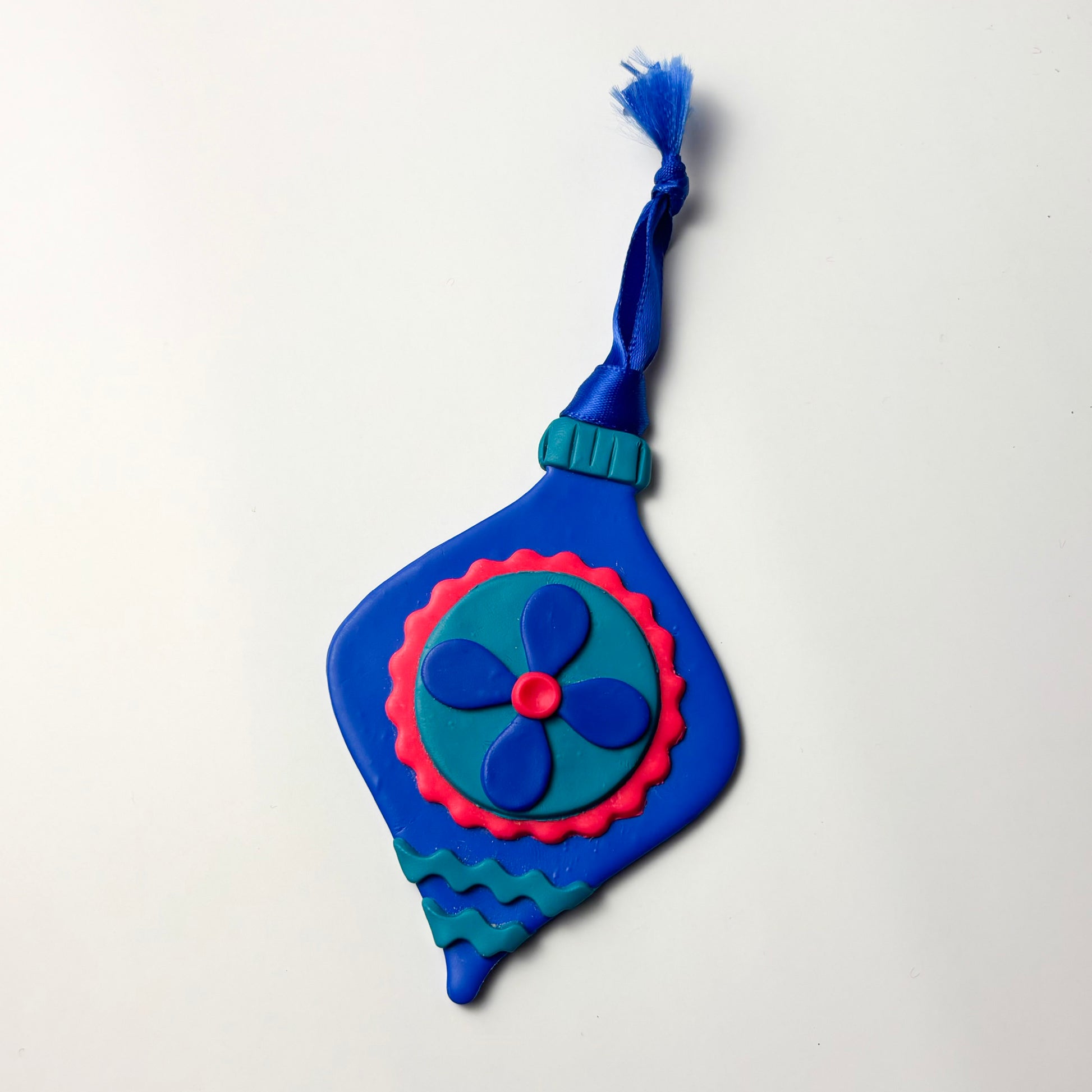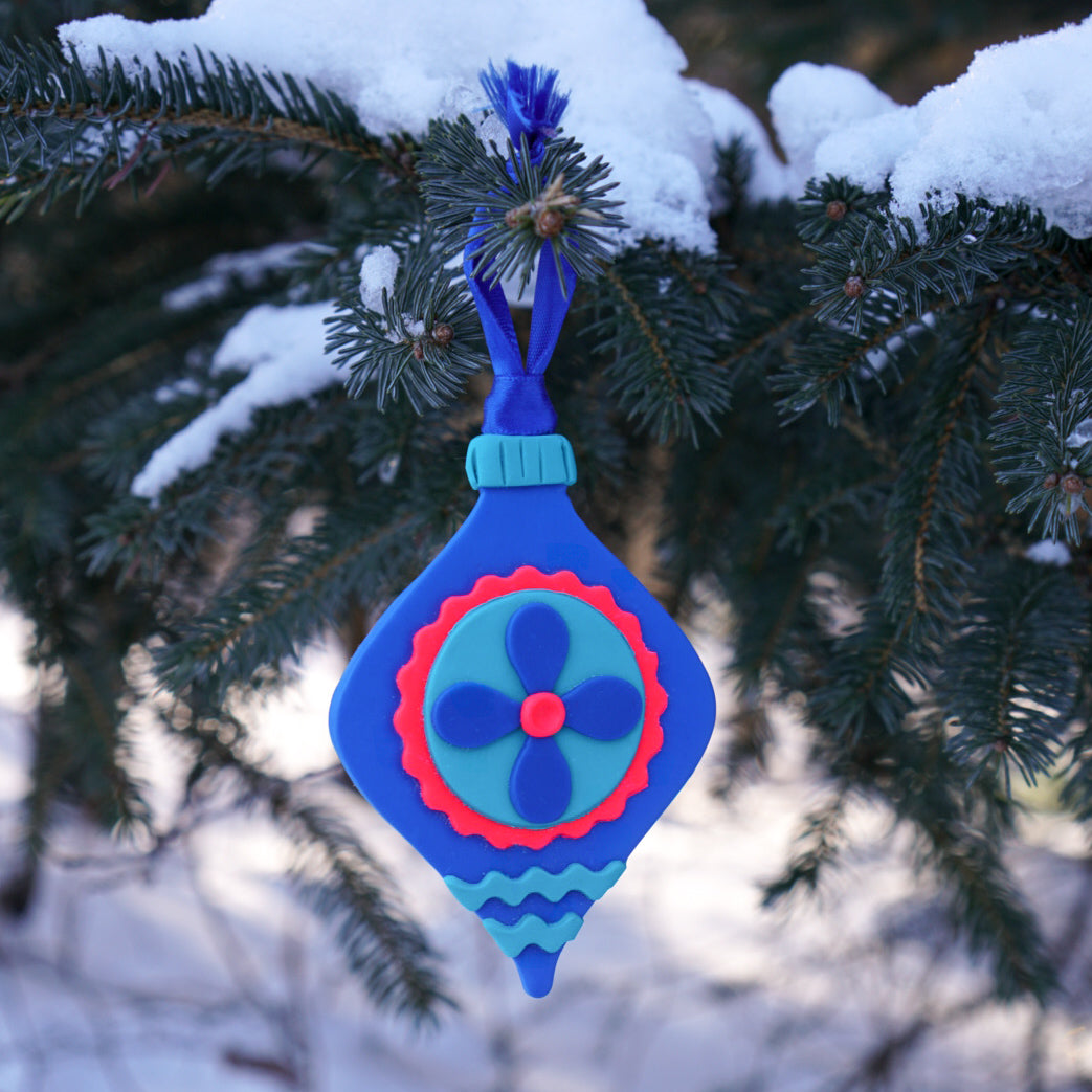 Pour un sapin qui sort de l’ordinaire, cet ornement bleu vif en argile polymère est un incontournable. Sa forme allongée et son motif floral bleu et rose lui donnent un style moderne et ludique, tout en rappelant les ornements vintage. Léger comme tout, il se fixe facilement aux branches sans les faire plier, grâce à son ruban assorti. Chaque ornement est fabriqué à la main en quantité limitée, ce qui en fait une pièce de collection idéale pour les amoureux.ses de décorations originales.
